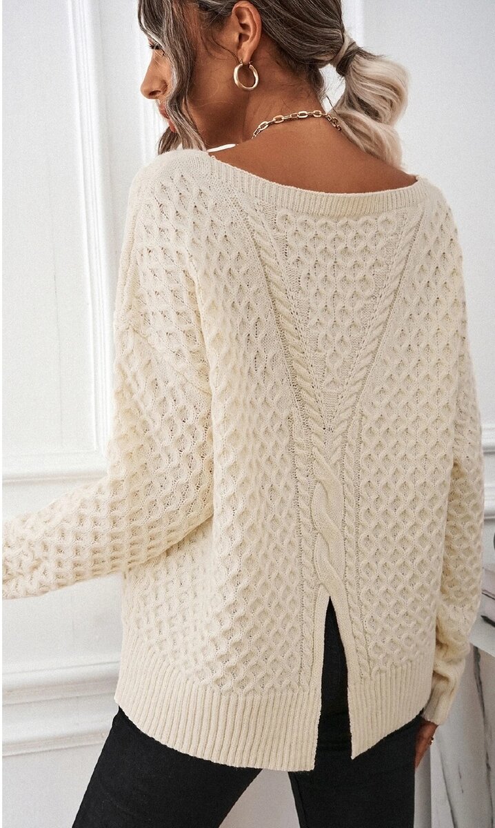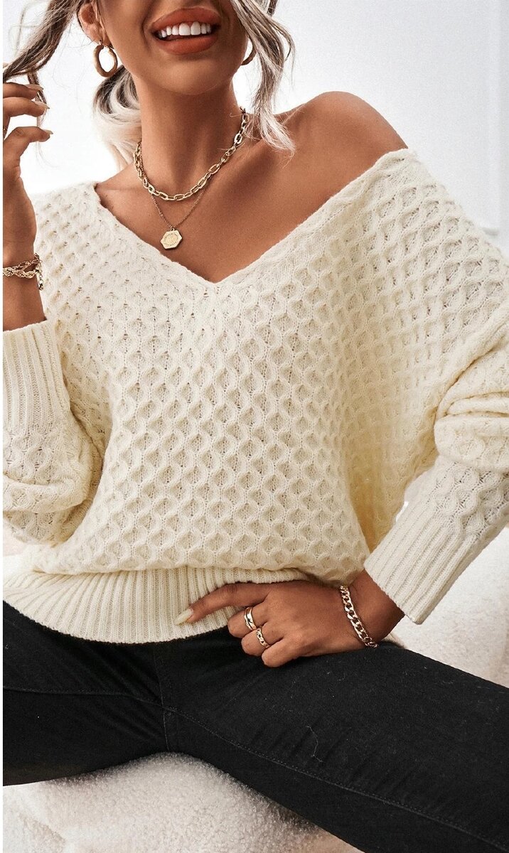 Первый свитер молочного цвета спереди – ничего особенного, связан полностью узором в виде крупных сот (к сожалению, я не знаю, как официально называется такой узор).
