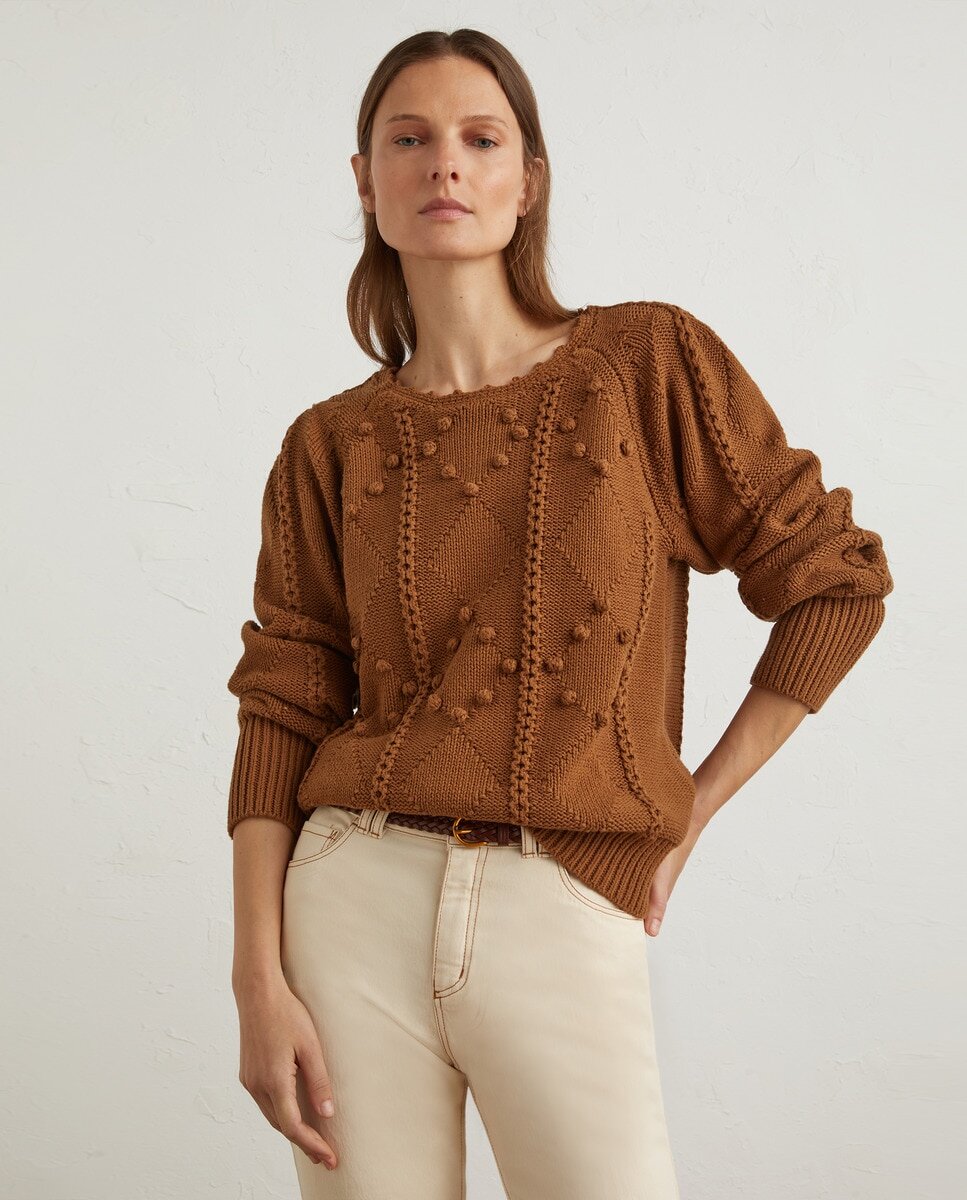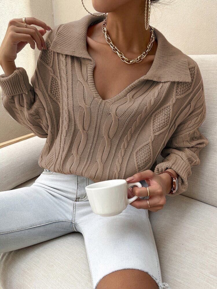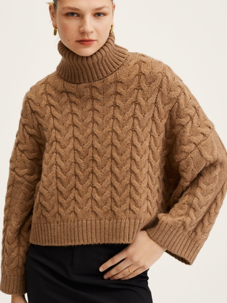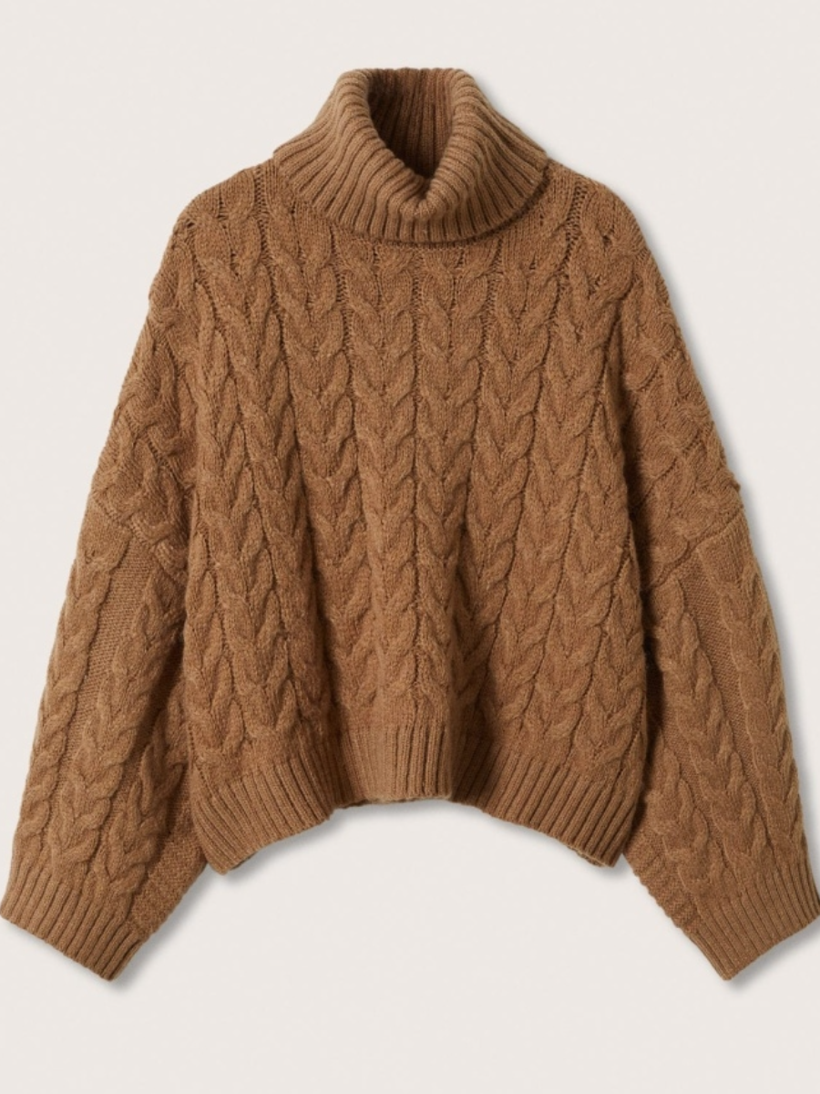 Второй свитер мне уже давно приглянулся, он цвета кофе с молоком. В нем мне нравится классический рельефный узор и немного необычное оформление ворота.