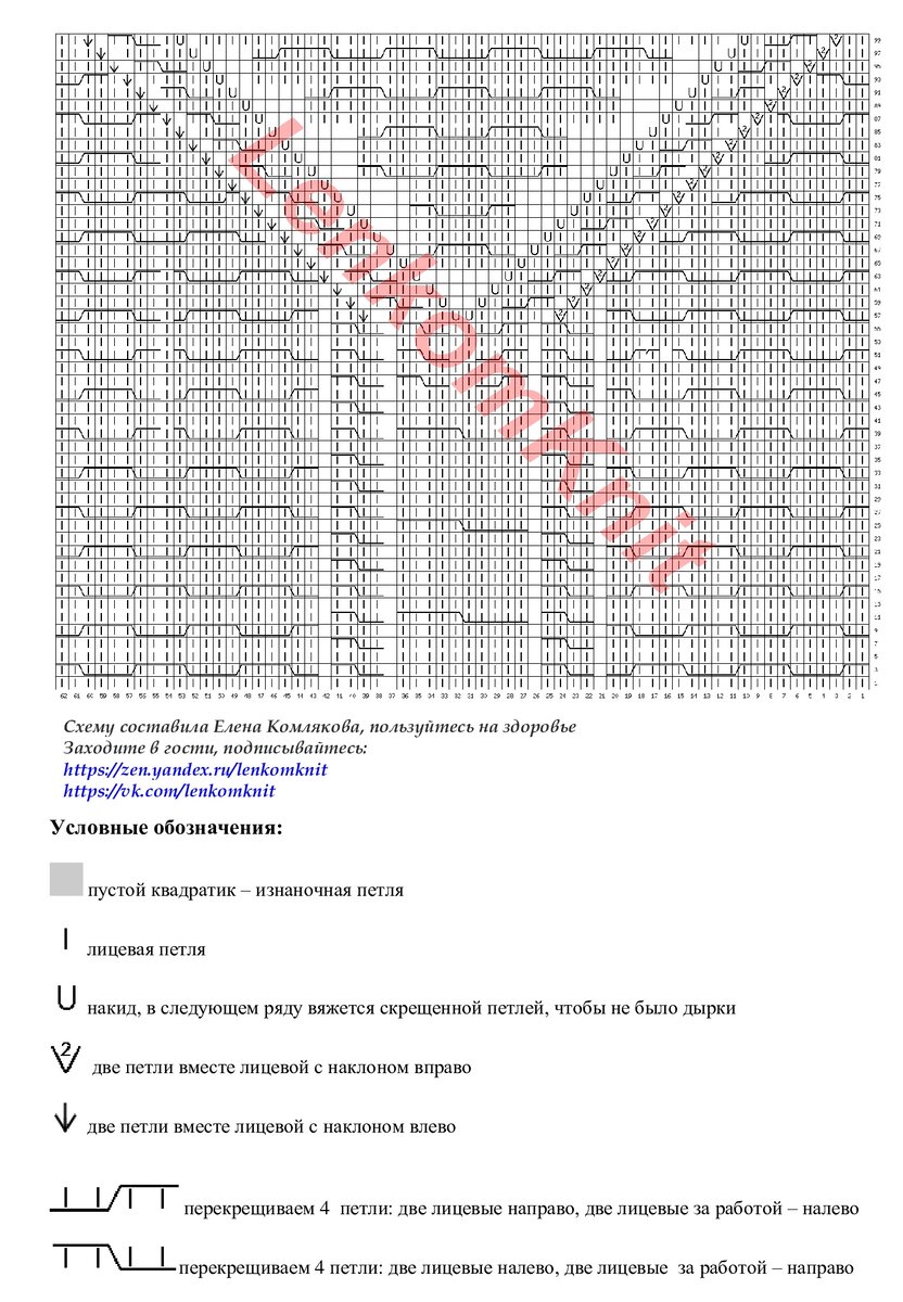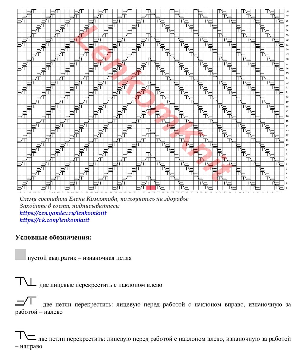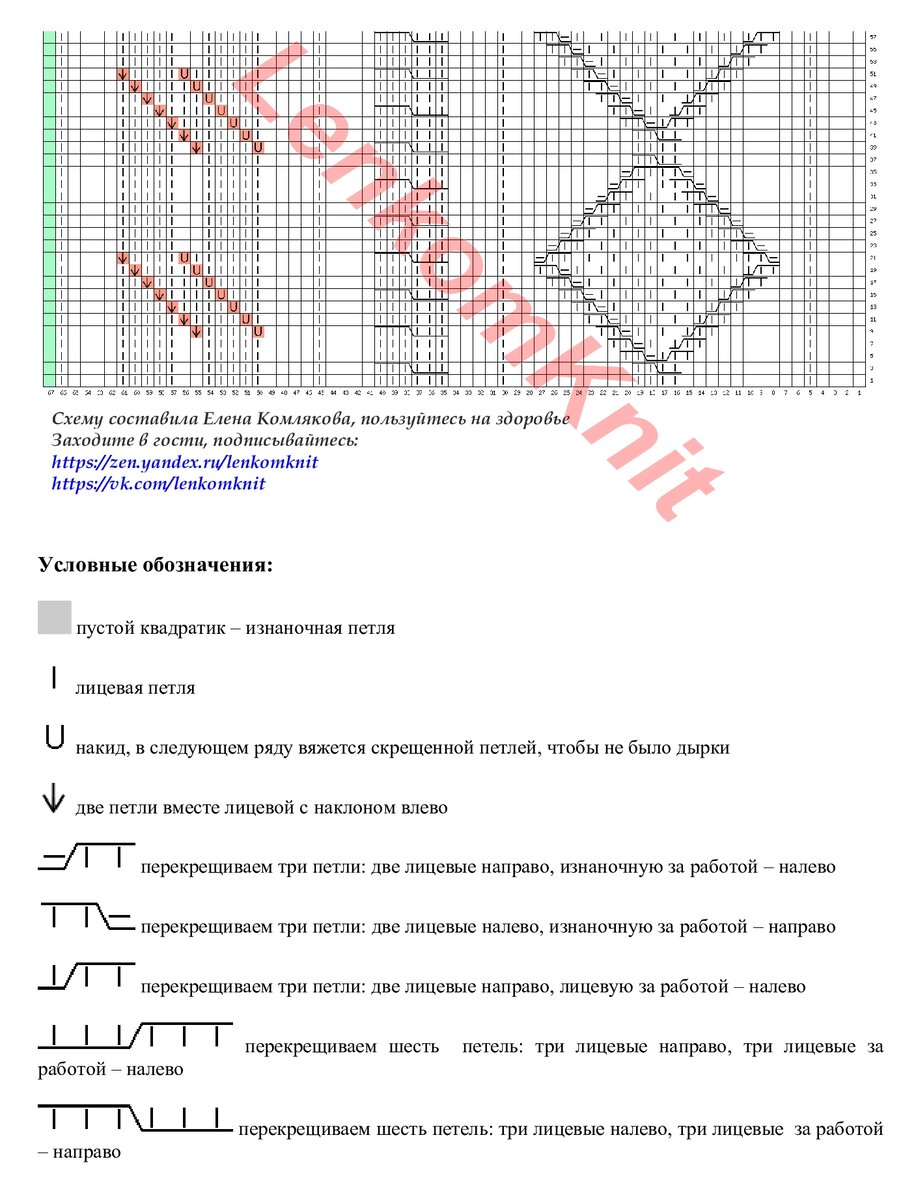 Схема узора составлена для лицевых рядов, изнаночные вяжем по рисунку. На схеме в ширину нарисован полный раппорт. А в высоту раппорт этого узора – с 1 по 64 ряд.