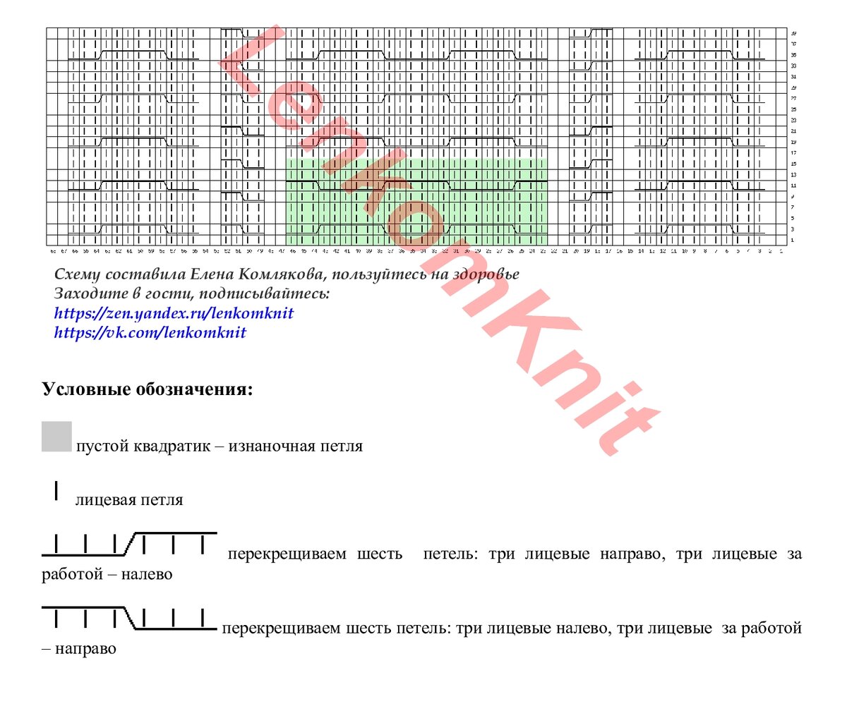 Схема узора – на рисунке (для лицевых рядов). Зеленым цветом отмечен раппорт центрального узора.