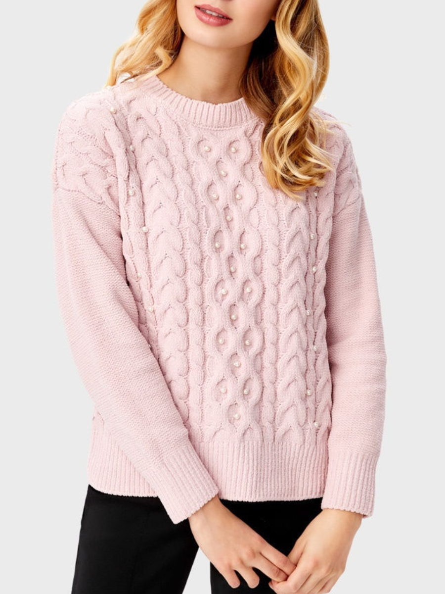 Свитер связан красивыми рельефными узорами из пряжи пудрового цвета. модель украшена бусинками – крупными жемчужинами.