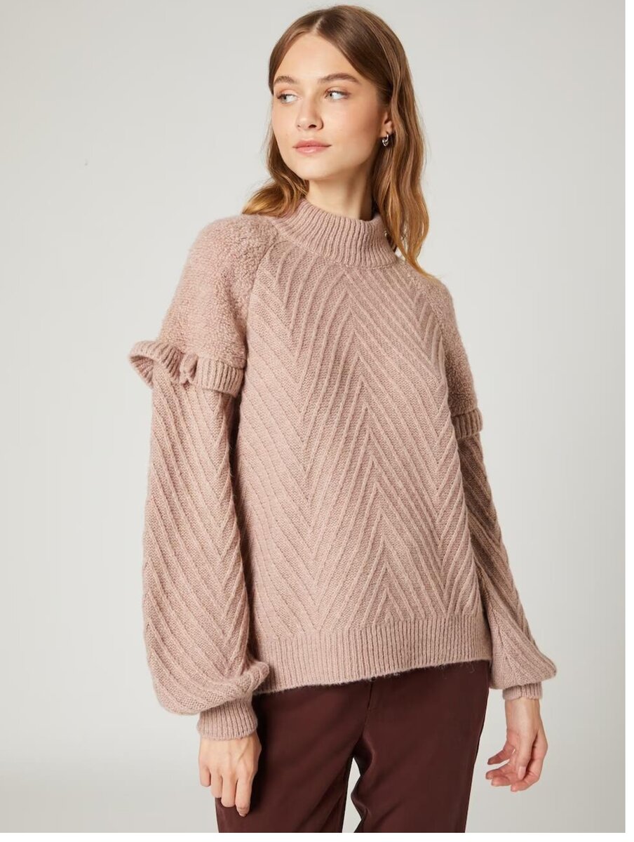 В модели использованы два вида пряжи одинакового цвета, но разной фактуры (рукав сверху связан из мягкой пряжи типа букле). Граница двух видов пряжи оформлена небольшими рюшами из резинки 1х1.