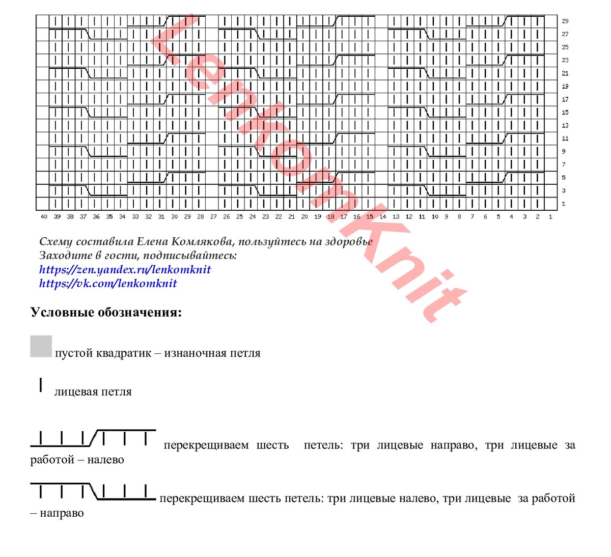 Схема узора – на рисунке. Мне кажется, что косы в этом свитере чуть-чуть смещаются (на два ряда). Возможно, они сделаны симметрично, но если их сместить, как на схеме, узор будет интереснее.